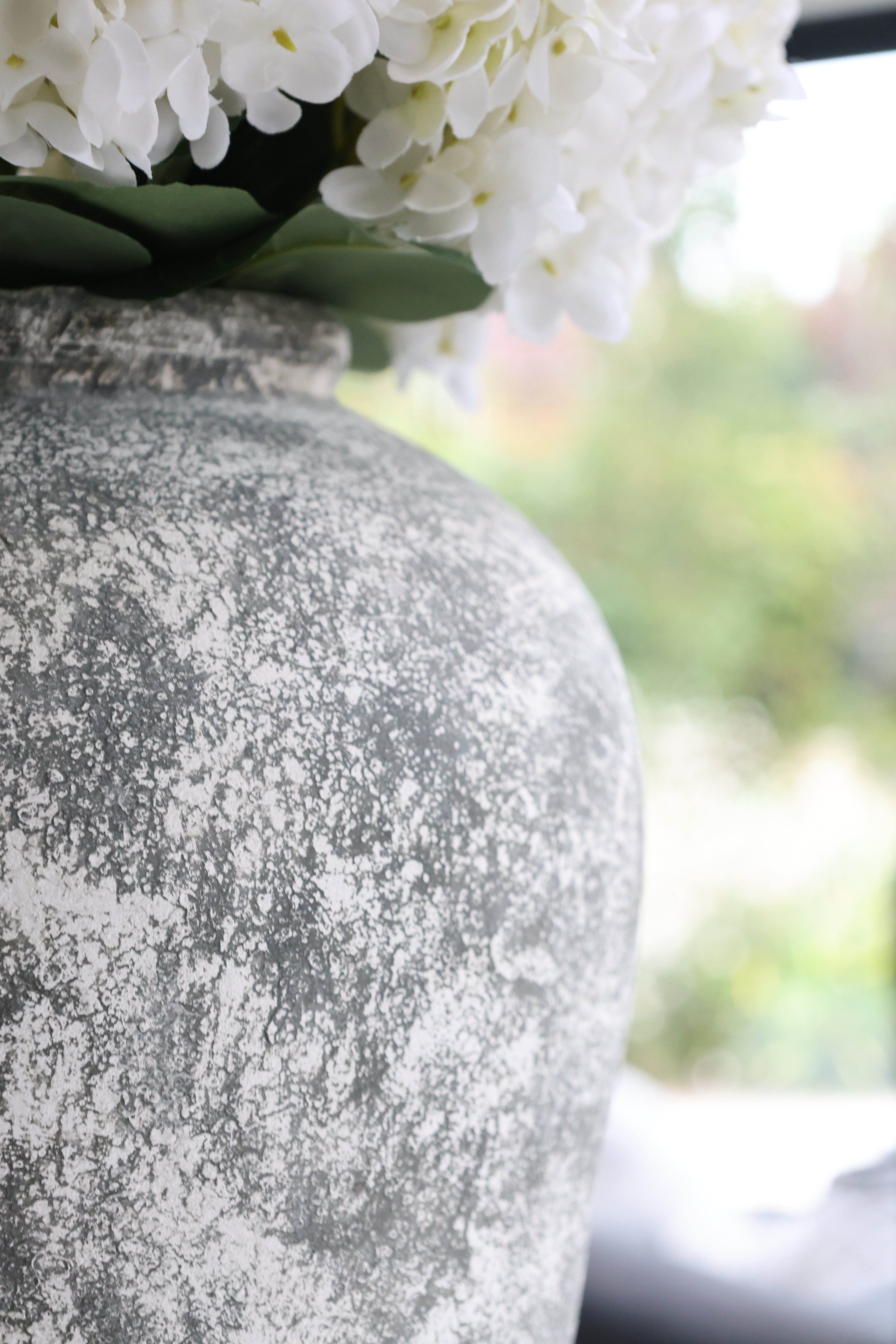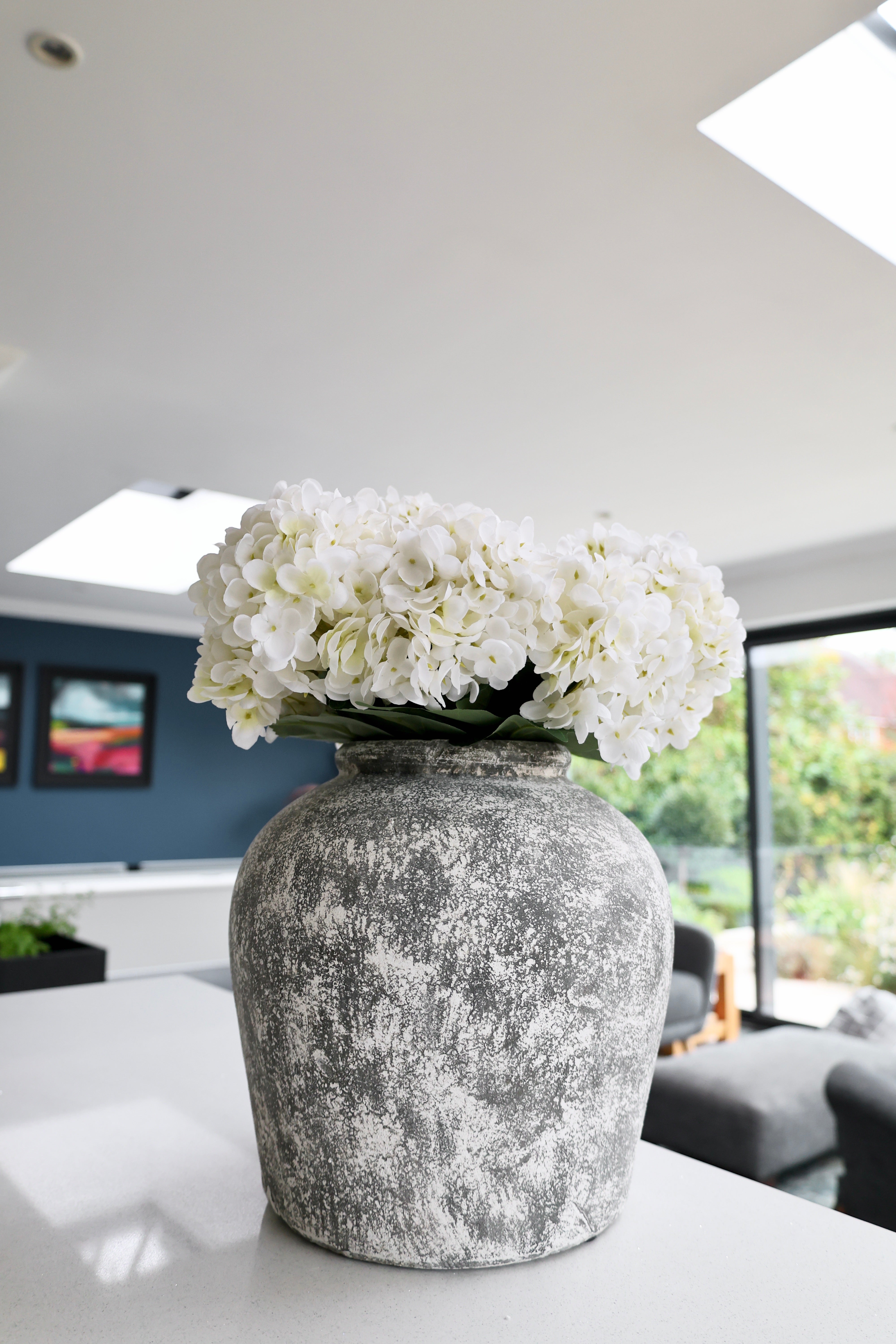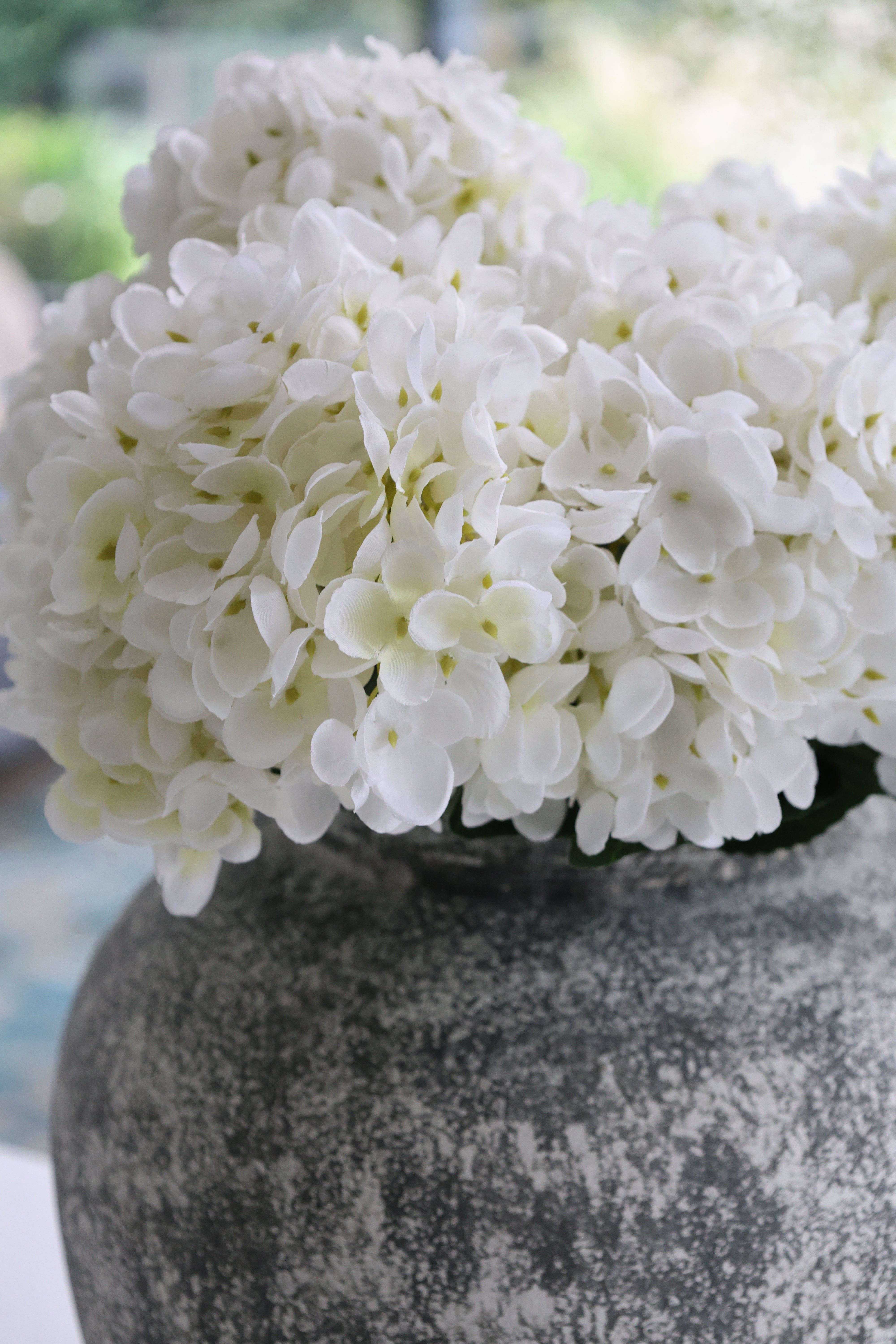 A timeless pairing of our white hydrangea faux arrangement and the Rudlow aged stone vase. The arrangement features three lifelike hydrangea stems, shaped to create a full, natural look with soft white blooms. Each stem is wired for easy adjustment, allowing you to style the display to suit your space. The Rudlow vase’s textured stone finish adds a grounded contrast to the delicate flowers, creating a calm, balanced focal point for any room.