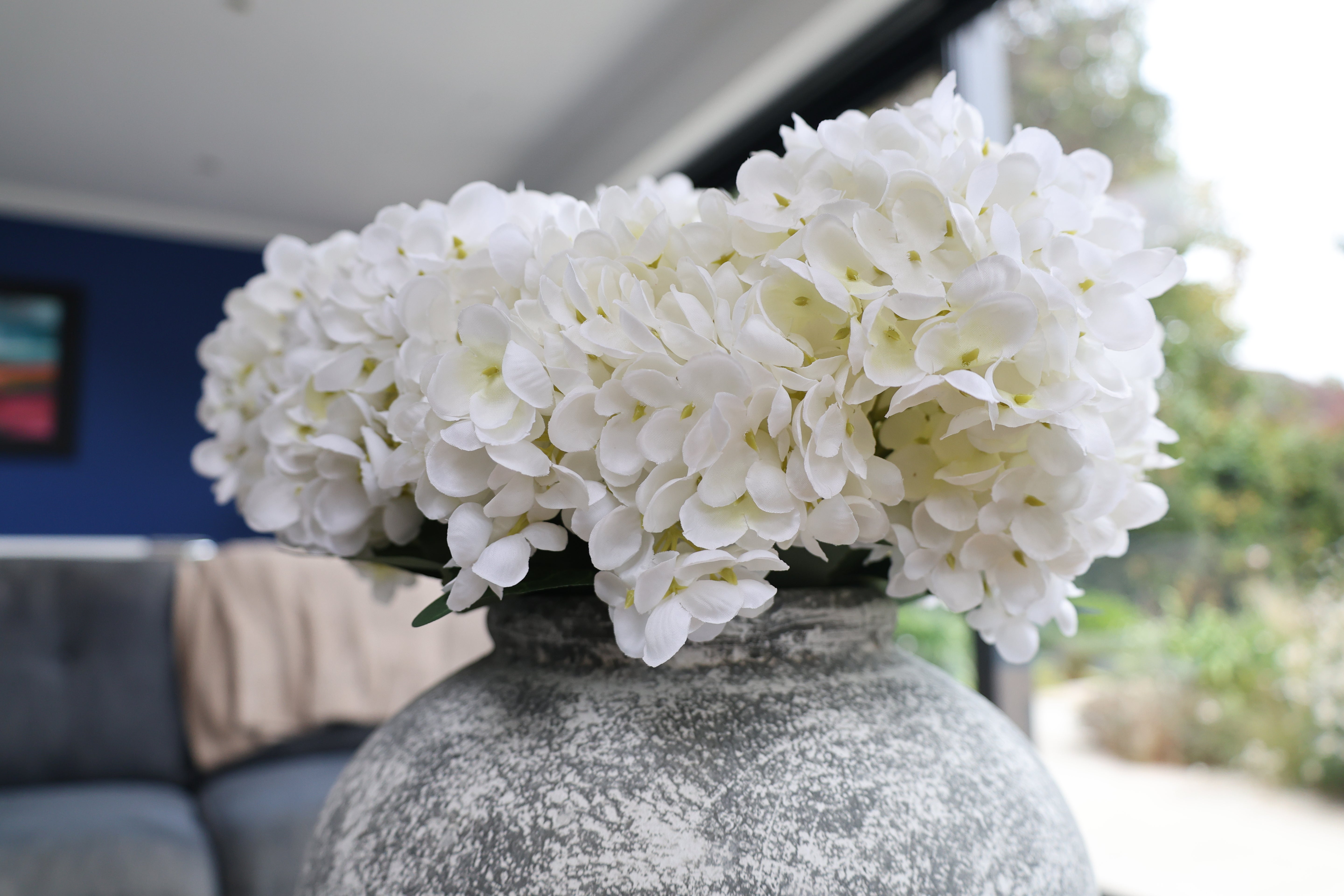 Quality faux hydrangeas retain their colour for years in typical indoor settings. To keep whites crisp, avoid prolonged direct sun and heat sources, dust occasionally, and display in dry interiors. If needed, a cool hair-dryer pass refreshes petals.